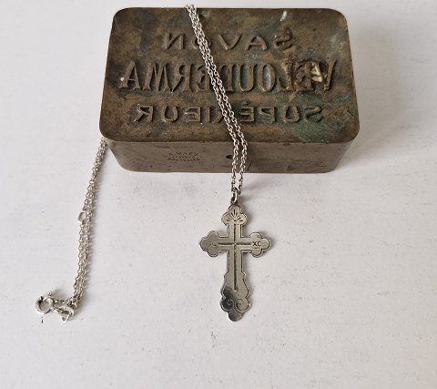 Smukt gammelt sølv kors i sølvkæde Selve korset er stemplet 813L. Kæden er stemplet 830s. Mål på korset 2,3 x 4 cm. Længde på halskæden 45 cm.