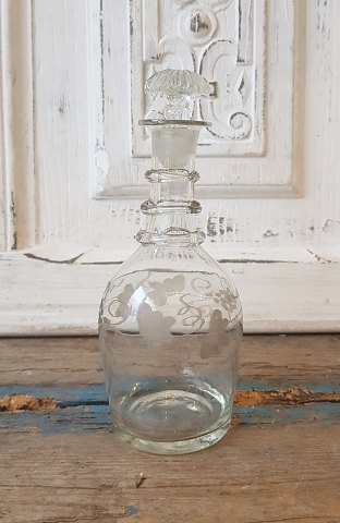 1800tals lille karaffel dekoreret med vinløv - tre runde ringe om halsen, indboret for presset prop. Højde 20 cm.